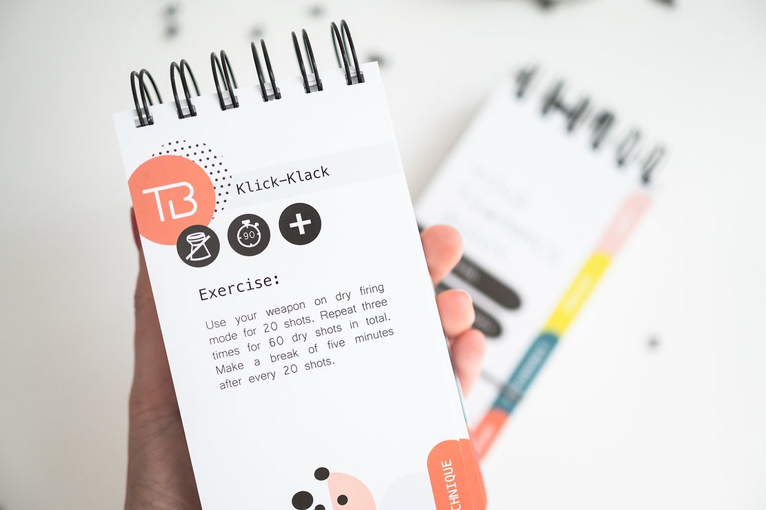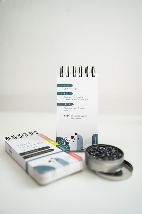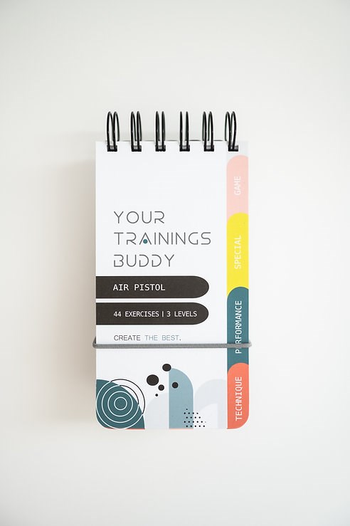 Trainingsbuddy is a training booklet with 44 exercises in three performance levels in a practical spiral pad (15 x 8 cm) that fits in any shooting bag.