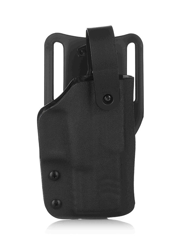 Öppet Kydexhölster med självlåsande bygel från Falco för Glock 17. Hölstret har ett rejält fäste för 2" / 50mm bälte och sitter tight mot höften. Hölstret är formgjutet för Glock 17 och vinkeln är rakt ner i benets riktning. Låsbygeln öppnas genom att trycka ner bygeln.