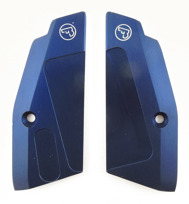 Blå Alu-kolvsidor till pistol CZ75. Passar bland annat CZ SP-01 Shadow (med magasinbrunn).