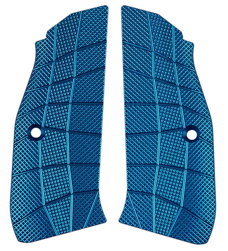 Kolvsidor i tunn blå aluminium från LokGrips i deras GridLOK design. Dessa kolvsidor är långa och anpassade för en CZ Shadow 2 utan magasinsbrunn.