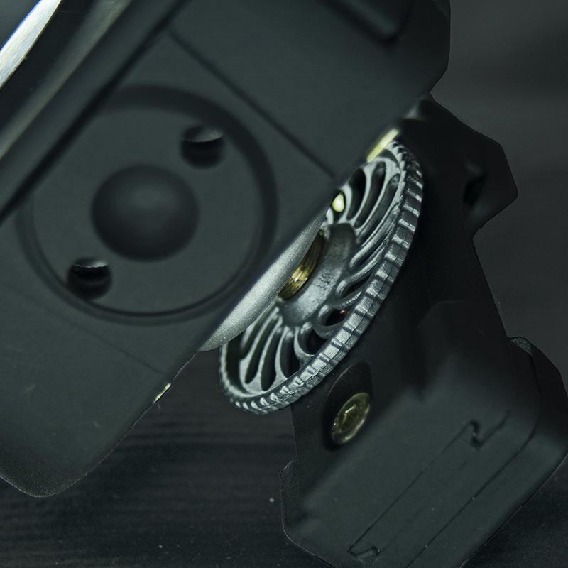 Snabbfästen med stor spännbricka för att spänna fast på hållaren som är skruvad i bältet. Enkel att ta av om du t ex vill packa ner dina magasinhållare i rangebagen. V2 har ett smalare fäste för bältet som ej tar lika mycket plats som V1. Fästet har dessutom inte solid baksida längre vilket gör att kardborren i bältet får kontakt med innerbältet trots ditsatt hållare.