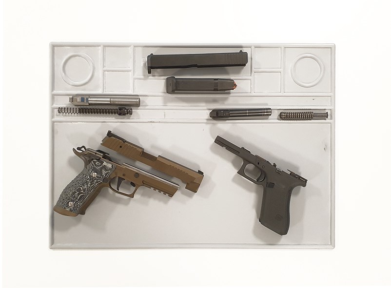 Kraftig gummimatta från Ransom Rest. Mattan är tjock och dämpande samt ganska tung och stabil. Har upphöjda kanter runt hela mattan. Ovandelen på mattan har en del olika fack med kanter av gummit där fjädrar, skruvar och brickor kan ligga och där de stannar kvar och inte rullar av. Perfekt för vapenvård och när du ska meka med ditt vapen. Största varianten.