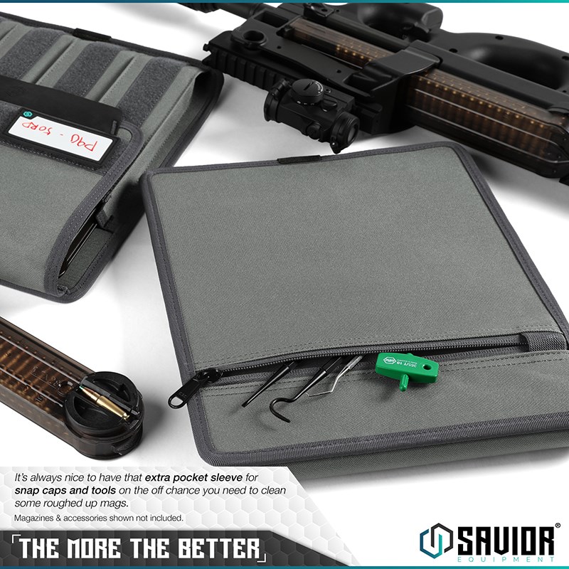 En smidig magasinhållare som underlättar organiseringen av din skytteväska. En händig lapp medföljer där man enkelt kan märka innehållet, t.ex. per magasintyp eller kaliber.